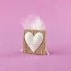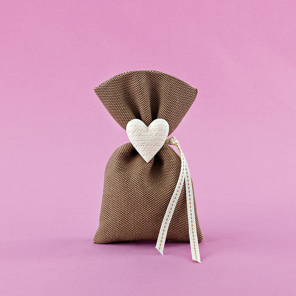 Μπομπονιέρα γάμου πουγκί καφέ υφασμάτινο και λευκή διακοσμητική καρδιά σκαλιστή
