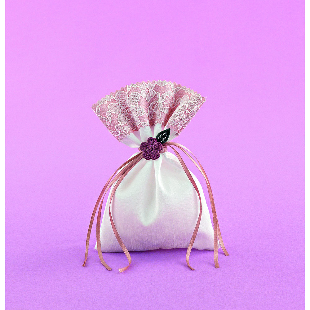 Μπομπονιέρα γάμου πουγκί σατέν με δαντέλα ροζ στην κορυφή και διακοσμητικό πλεκτό λουλούδι στο δέσιμο