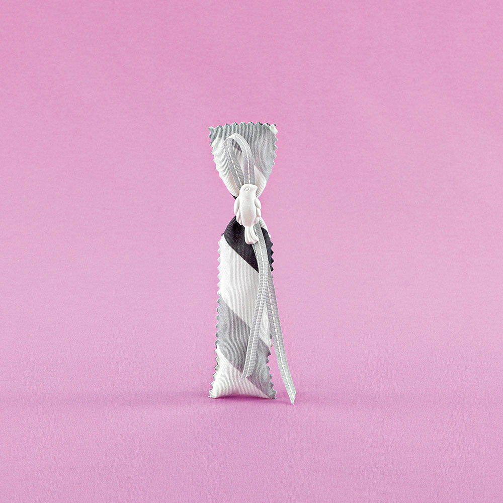 Μπομπονιέρα γάμου πουγκί στενό ριγέ με διακοσμητικό πουλί. Όλες οι μπομπονιέρες περιλαμβάνουν 5 κουφέτα κλασσικά αμυγδάλου χατζηγιαννάκης (υπάρχει δυνατότητα αλλαγής στα κουφέτα με την ανάλογη χρέωση ανάείδος επιλογής).