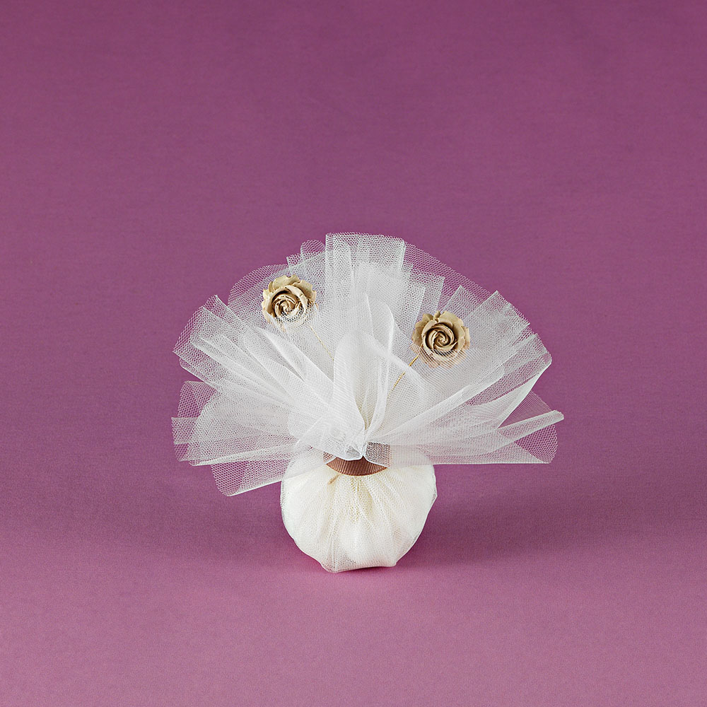 Μπομπονιέρα γάμου τούλι γαλλικό και διακοσμητικά λουλουδάκια που ενώνονται με χρυσό σύρμα