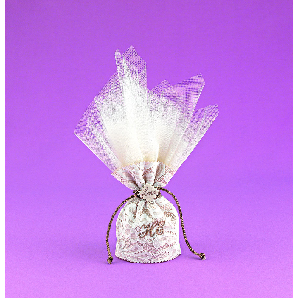 Μπομπονιέρα γάμου τούλι και εξωτερικό φορετό ύφασμα με κεντημένα τα αρχικά γράμματα καθώς και διακοσμητικό LOVE