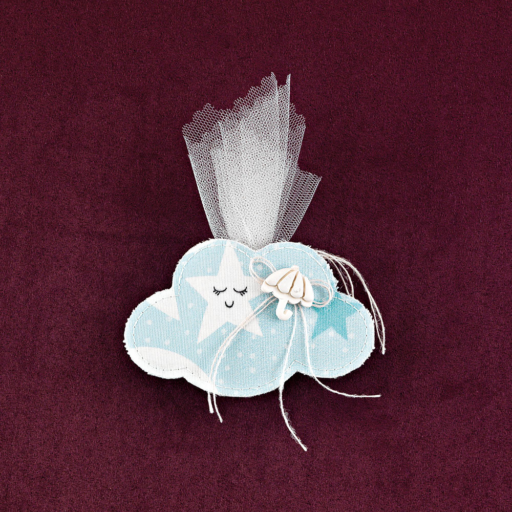 Μπομπονιέρα βάπτισης υφασμάτινο συννεφάκι με αστεράκια και λευκή διακοσμητική ομπρέλλα